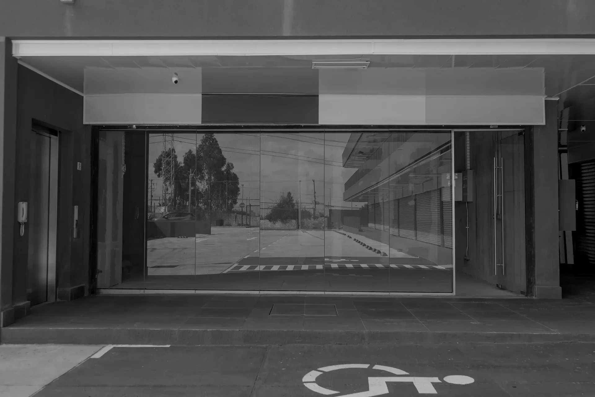 Entrada con cortina metálica automatizada.